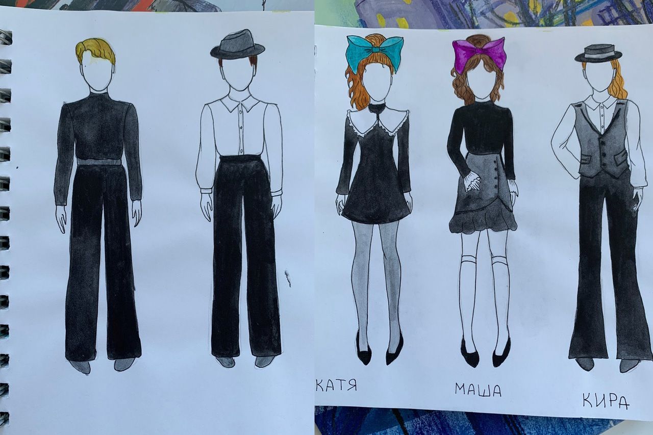 Дети одеты в черно-белых тонах. Как комикс. Как кадр из черно-белого фильма. Как страшный сон маленькой девочки. Постепенно в спектакле появляются еще два цвета: ФИОЛЕТОВЫЙ и ЗЕЛЕНЫЙ. Для меня это сочетание творческого безумия. Огромные банты, леденцы, корабль... К концу спектакля цвЕта становится все больше и сон становится цветной.